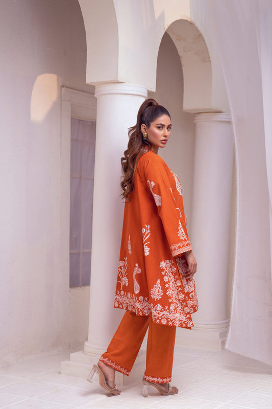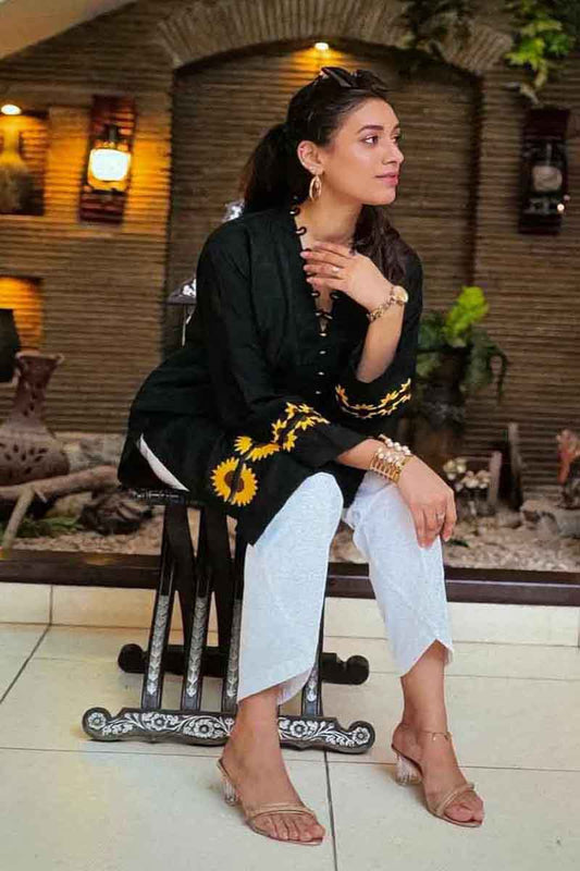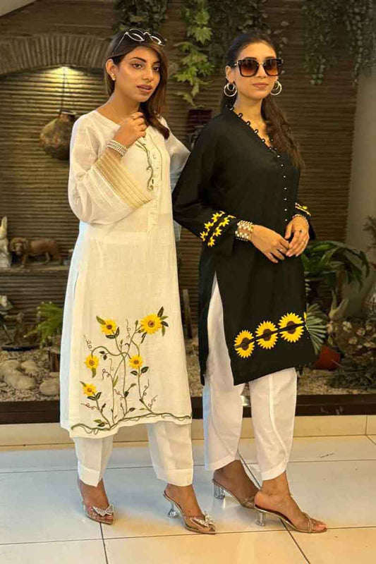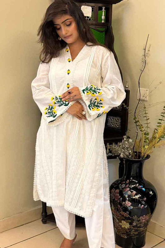 2 Piece Cotton White Daisy Stitched Casual Dress